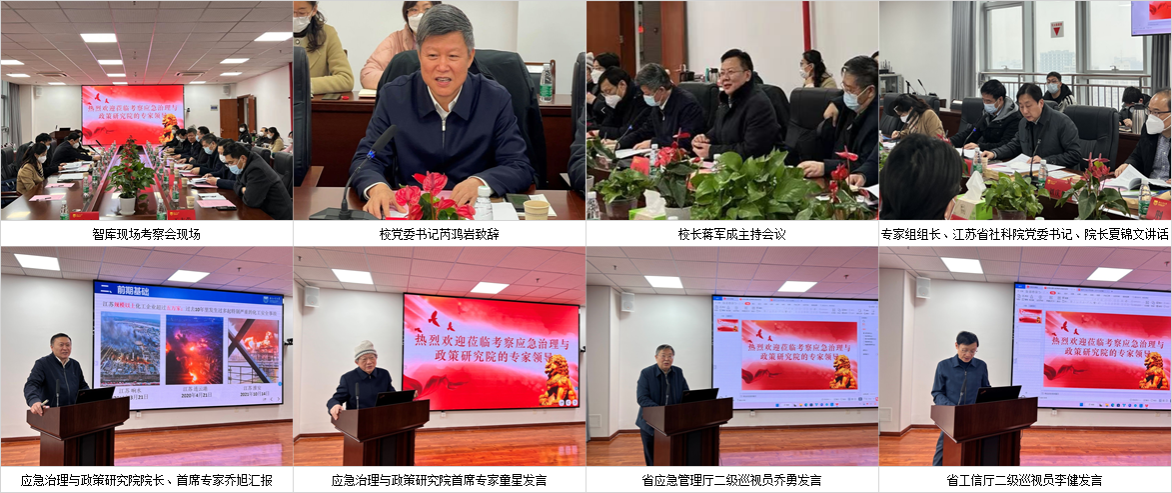 2022年12月16日上午,智库现场考察会;校党委书记芮鸿岩致辞;校长蒋军成主持现场考察会;专家组组长、江苏省社科院党委书记、院长夏锦文讲话;智库院长、首席专家乔旭汇报;智库首席专家童星发言;江苏省应急管理厅二级巡视员乔勇发言;江苏省工信厅二级巡视员李健发言