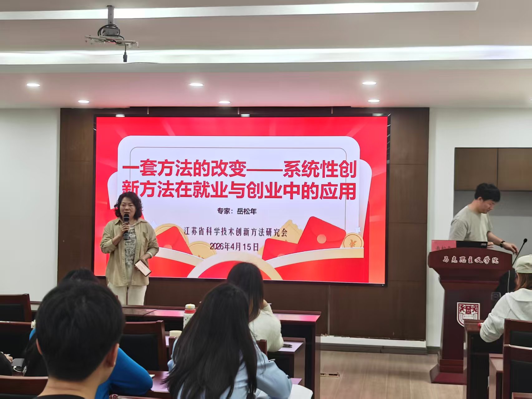 4月15日,由校科协、马克思主义学院、江苏省科学技术创新方法研究会联合举办的“劝业青科汇”第二十二期论坛在江浦校区举行。本次论坛聚焦马院学生就业创业、创新能力落地等现实难题,特邀江苏省科学技术方法研究会专家岳松年,做“以系统性创新方法赋能就业创业”的主题报告。