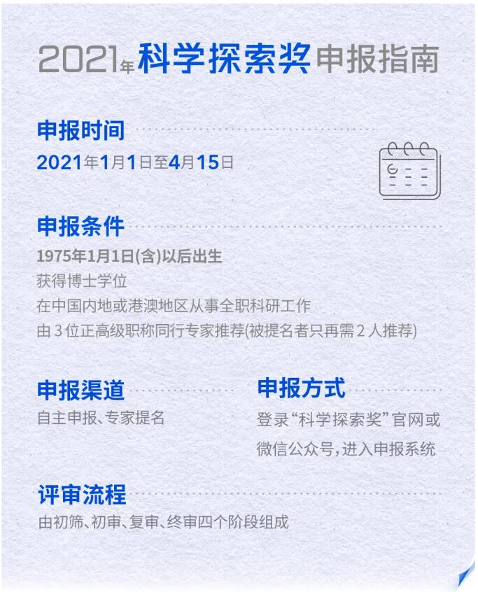 年龄不超过45周岁,取得博士学位,且全职在中国内地及港澳地区工作的青年科技工作者都可以按照相关指引,通过“科学探索奖”官方网站(http://www.xplorerprize.org)进行申报。申报截止日为2021年4月15日,之后将由评审委员会独立开展评审,获奖名单预计将在2021年9月揭晓。