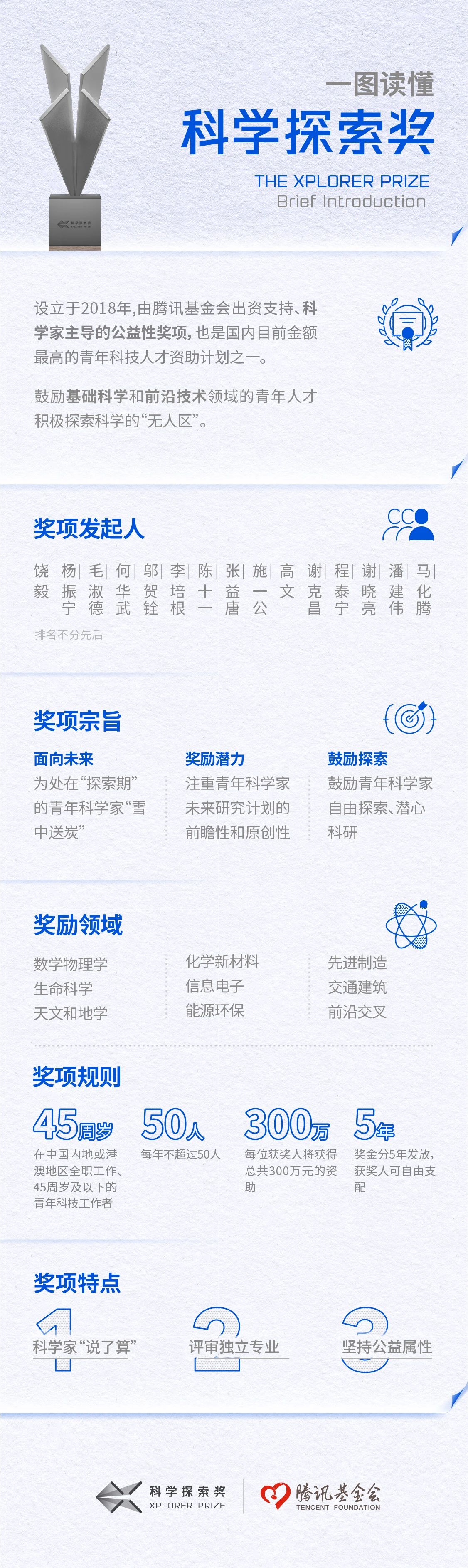 “科学探索奖”三年前于腾讯公司成立20周年之际设立,目前已经资助了100位优秀的青年科学家。“科学探索奖”设立的出发点是探索社会力量支持基础研究的长效机制,鼓励青年科学家勇闯科学“无人区”。服务国家战略、履行社会责任、投身公益事业,也是腾讯公司应尽的义务。